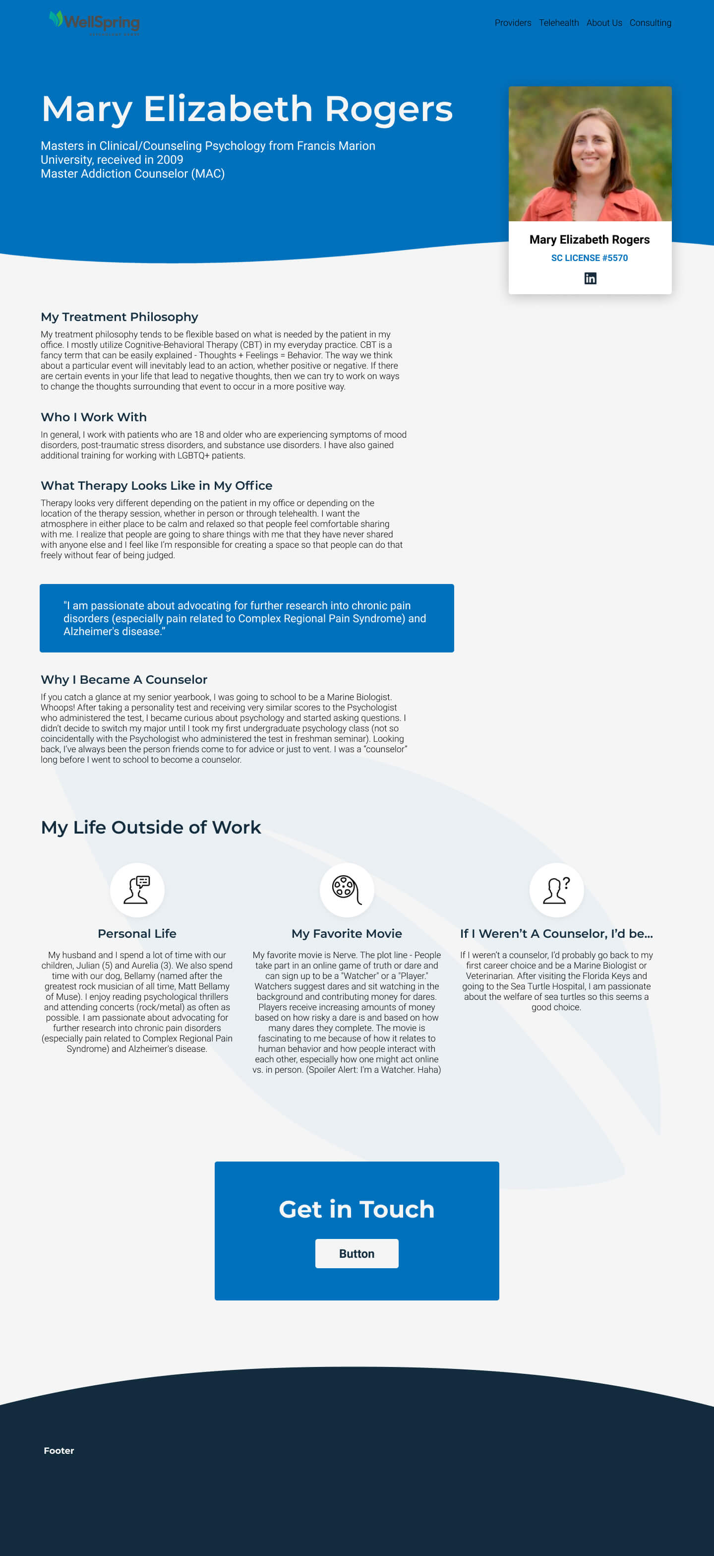 Oct 2020 - March 2021Developing and implementing new designs for a psychology practice using Webflow. The live website can be viewed here.