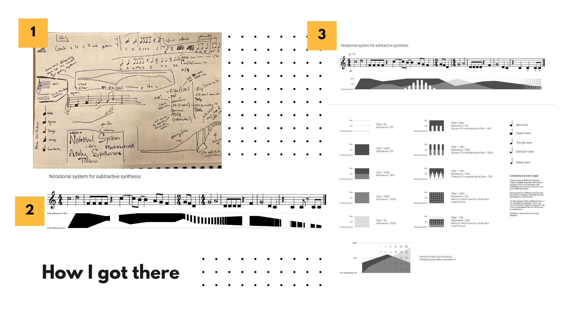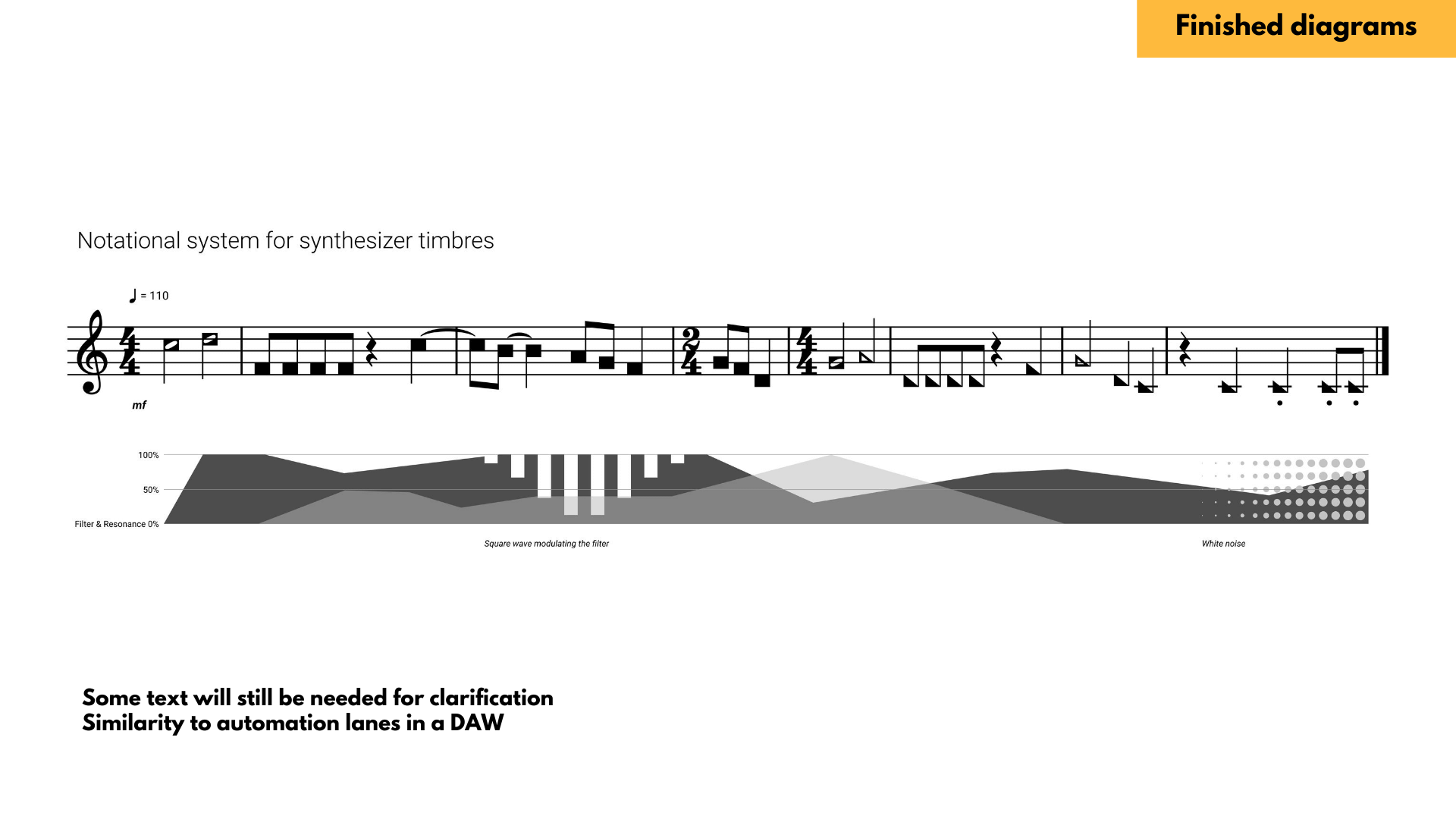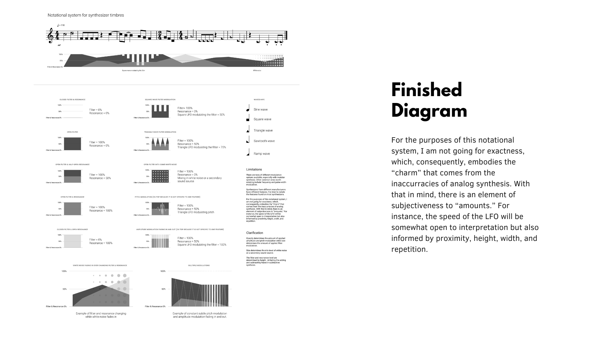 For my final project for one of my grad school classes I developed a notational system for synthesizer timbres. This project was particularly interesting to me because there is no universal notation for synthesizer timbres, or timbres in general, but there are enough universal features across synthesizers that a notational system could actually work.