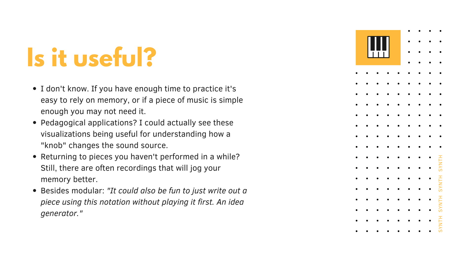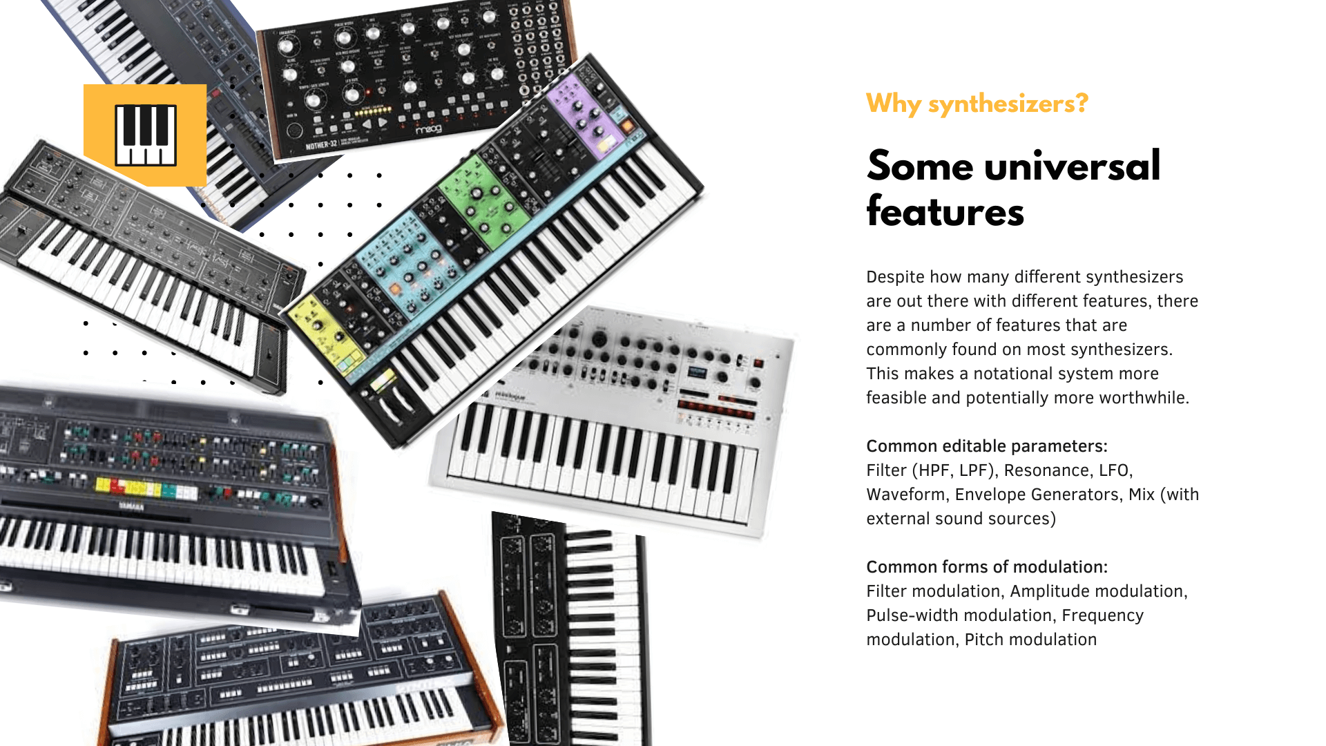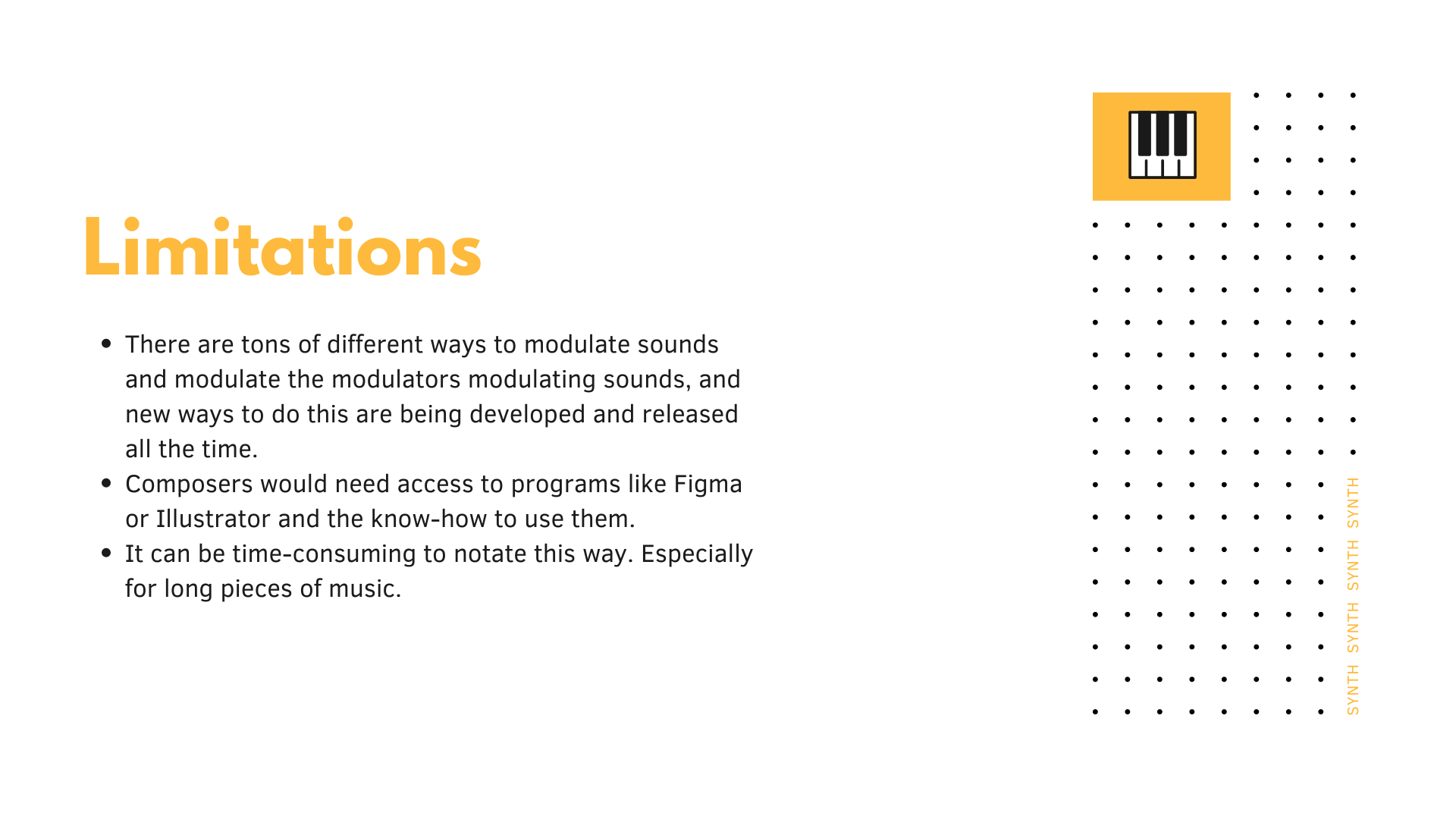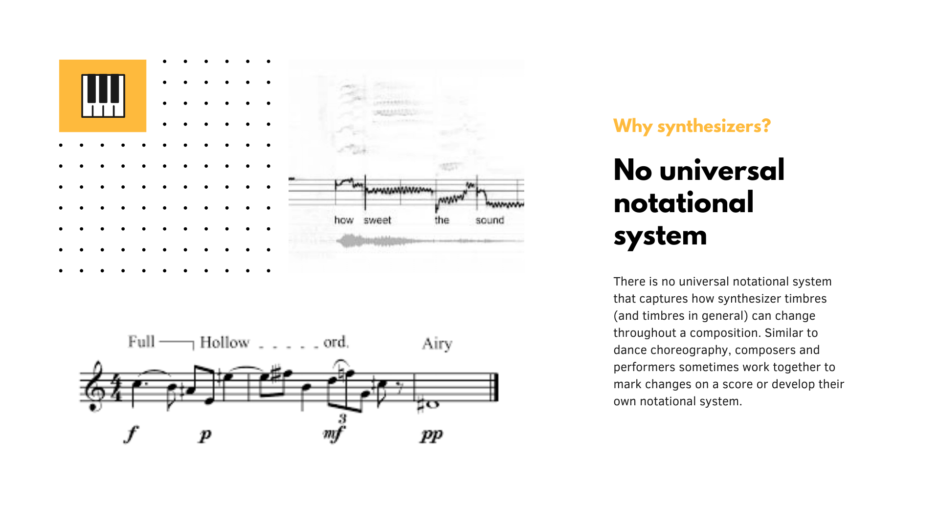 For my final project for one of my grad school classes I developed a notational system for synthesizer timbres. This project was particularly interesting to me because there is no universal notation for synthesizer timbres, or timbres in general, but there are enough universal features across synthesizers that a notational system could actually work.
