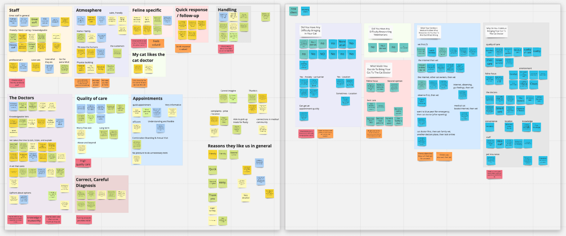 My second affinity map compared the Cognito Survey with our NPS survey. I looked for similarities between why new clients decided to come to the Cat Doctor and why returning clients kept coming back. Analyzing this data revealed the most important reason was they wanted "a veterinarian who answers my questions."