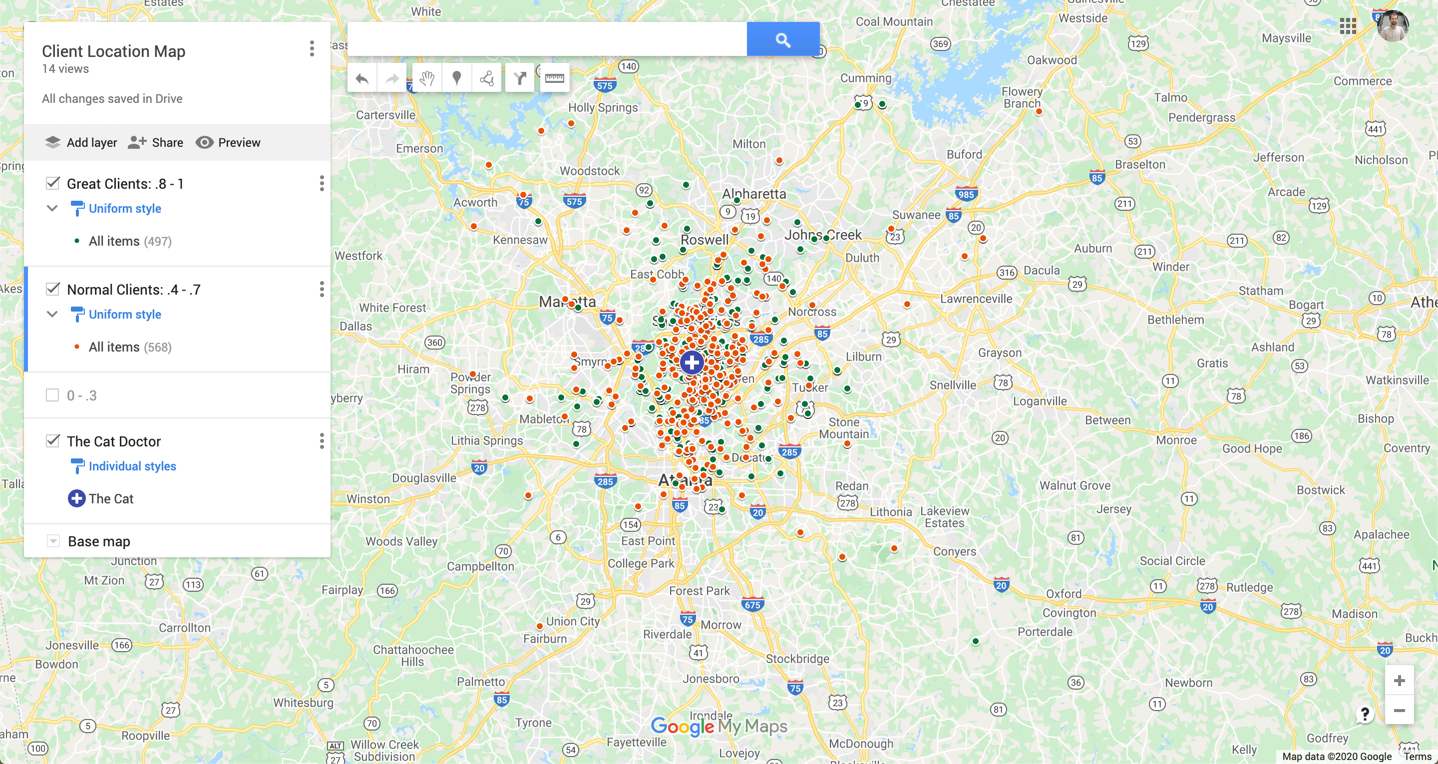 To take this data a step further, and out of curiosity, I decided to see if there were any trends between client locations and how often they visited. Using google mapping sheets, I created an interactive map showing where great clients and good clients live. This revealed that the majority of clients live within a “diamond” shape. Previously, ads had been targeting people within a 25 mile radius of the Cat Doctor. Using this map, my PM reduced the radius and focused on targeting people within this diamond.