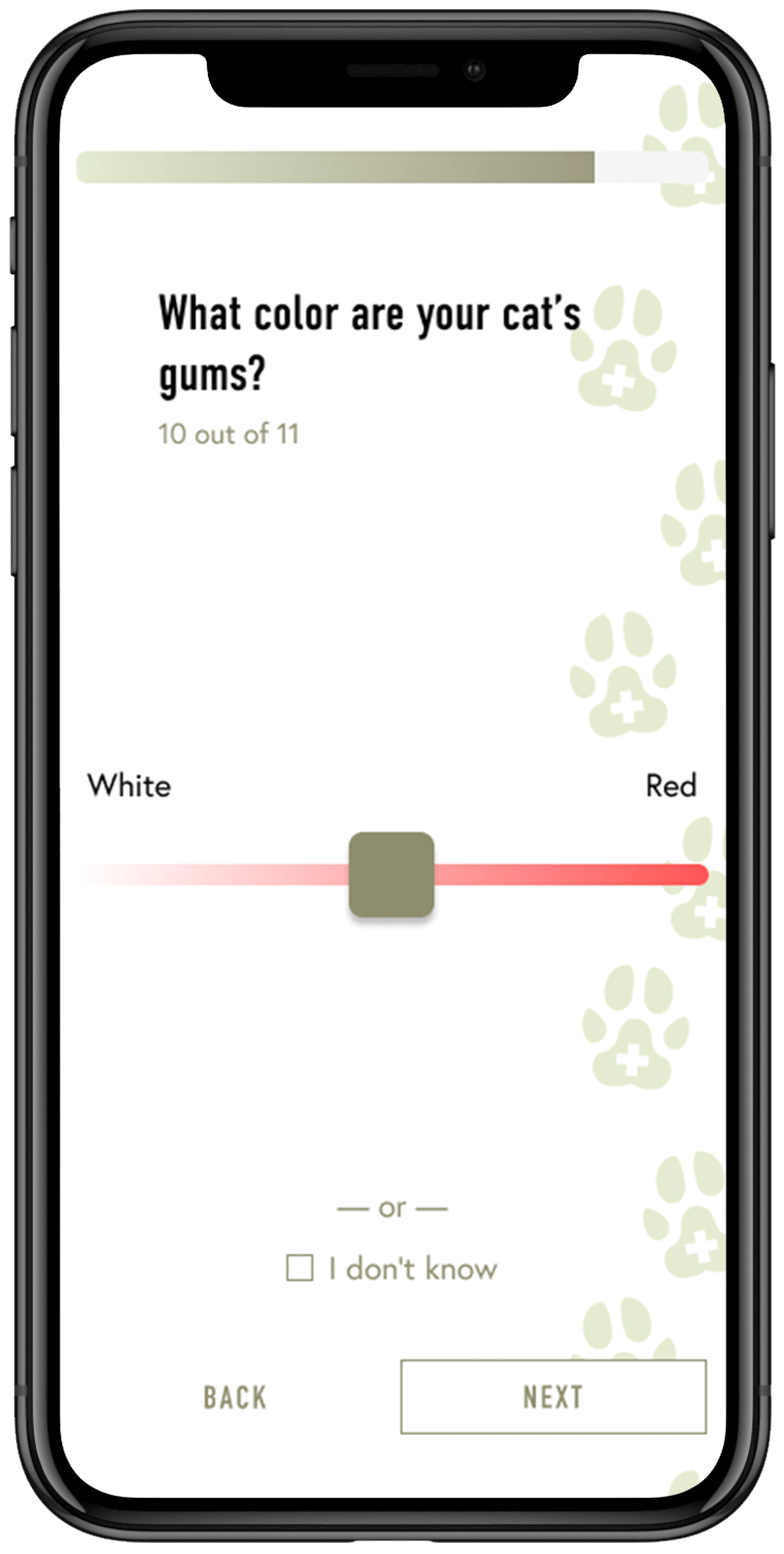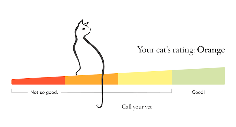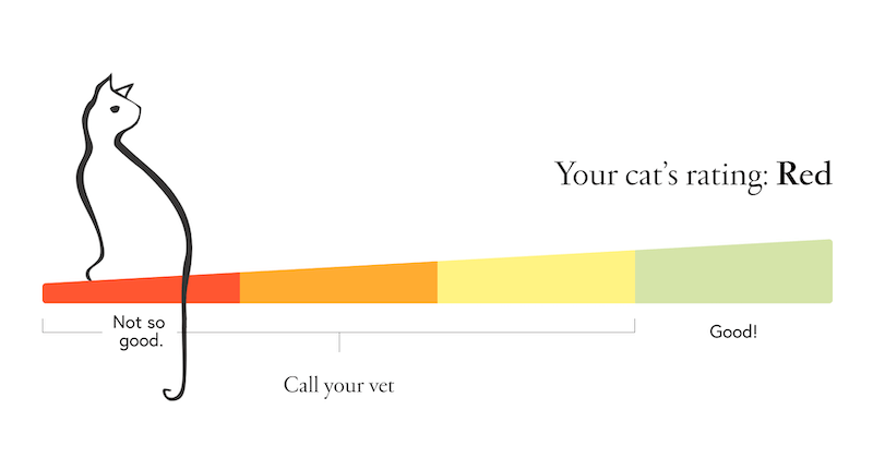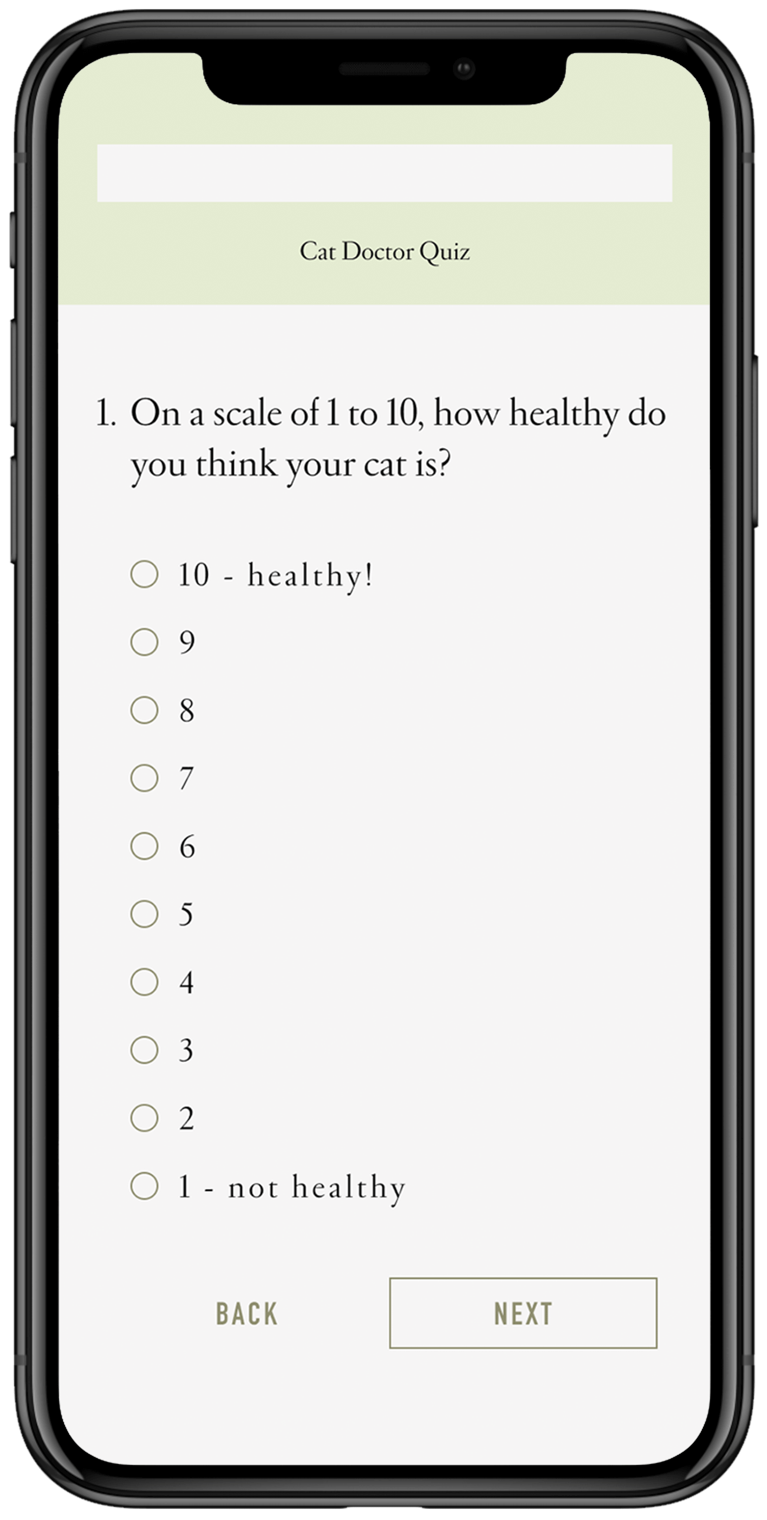After researching different ways of building a simplified version of our online diagnostic tool, we settled on creating it with Typeform. This allowed us to use sliding scales for answers, and also let us develop a mathematical way of weighing responses. For instance, if a user had more than one alarming answer - such as my cat abruptly started loosing weight and is drinking lots of water - their cat's rating would be "red." Each color has specific explanations and reminds users to check with their veterinarian first before making any decisions.