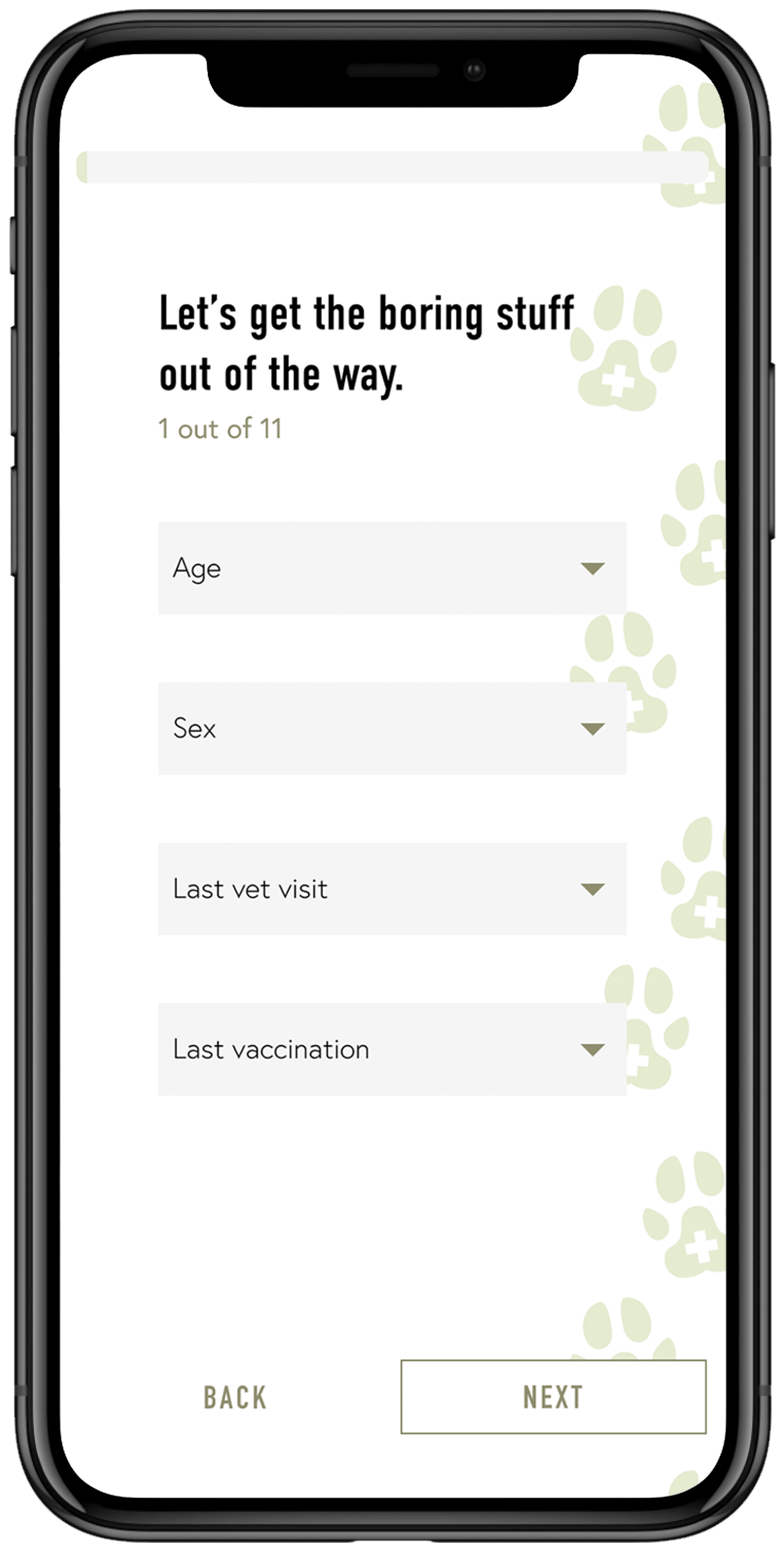 The first step towards creating this was developing questions. These questions had to be something that clients could easily answer yet provide us with enough details so that we could offer informed suggestions. For that, we needed a blend of what clients could see or check in their own homes and what veterinarians do during exams.