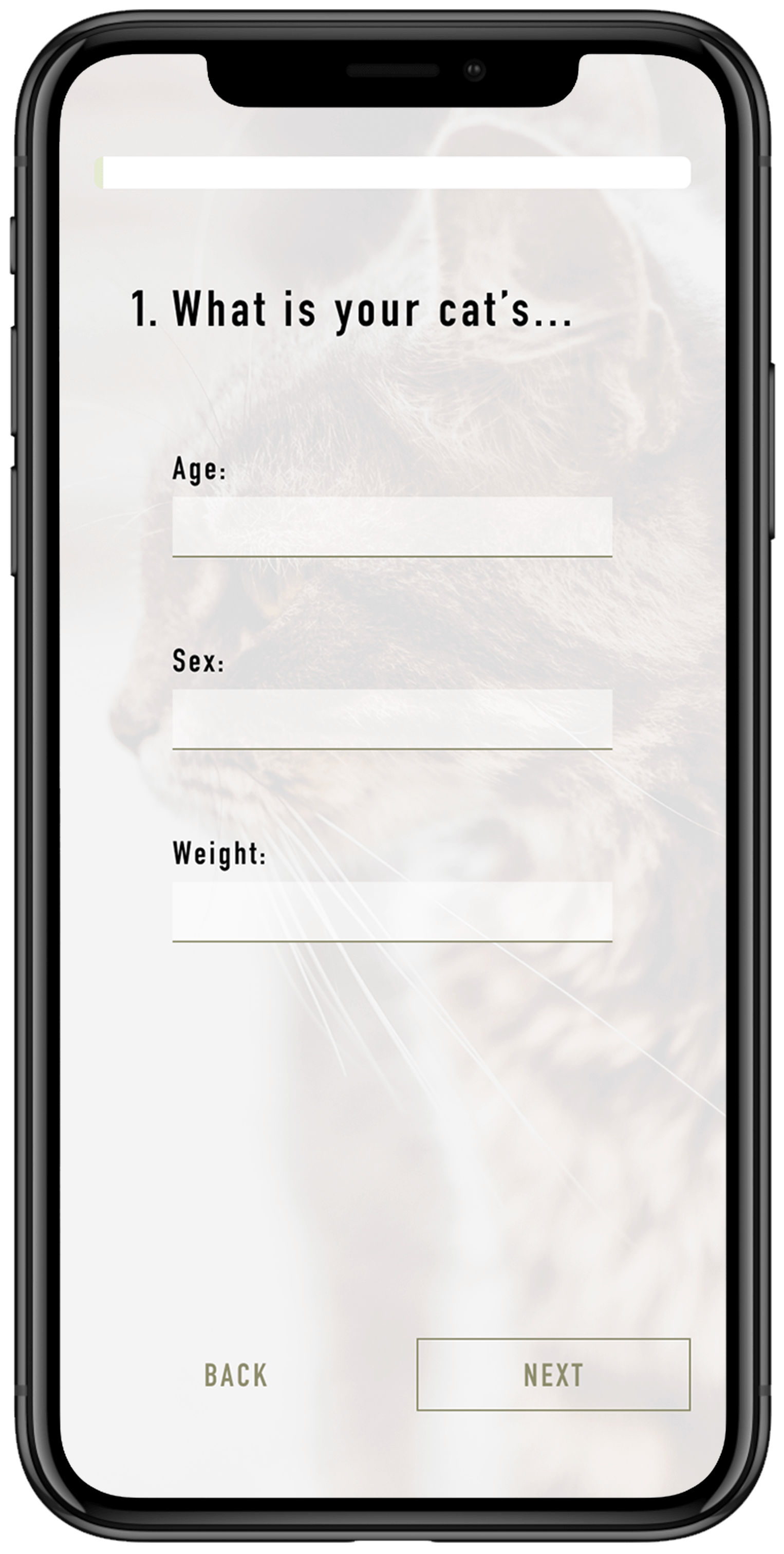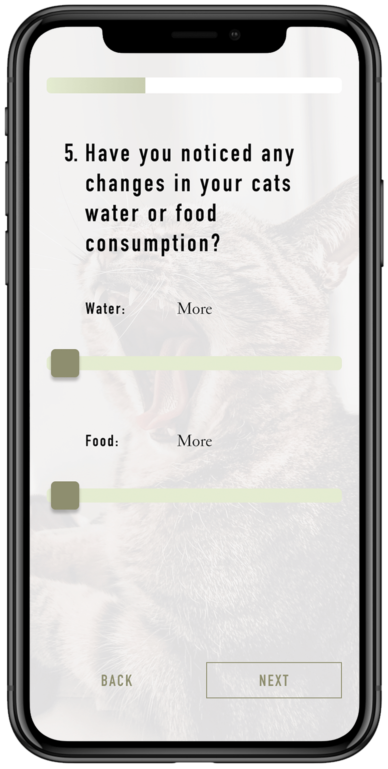 When combined, the answers to these questions can help us paint a good picture of a cat's overall wellbeing. After testing early versions of my designs, we noticed that asking for very specific answers proved difficult for our users. We decided that we didn't need to know exact weight, or exactly how often a cat vomited or coughed up hairballs, but we needed an estimate. So almost all of the questions became sliding scales, offering an easier and interactive solution while still providing us with pertinent information.