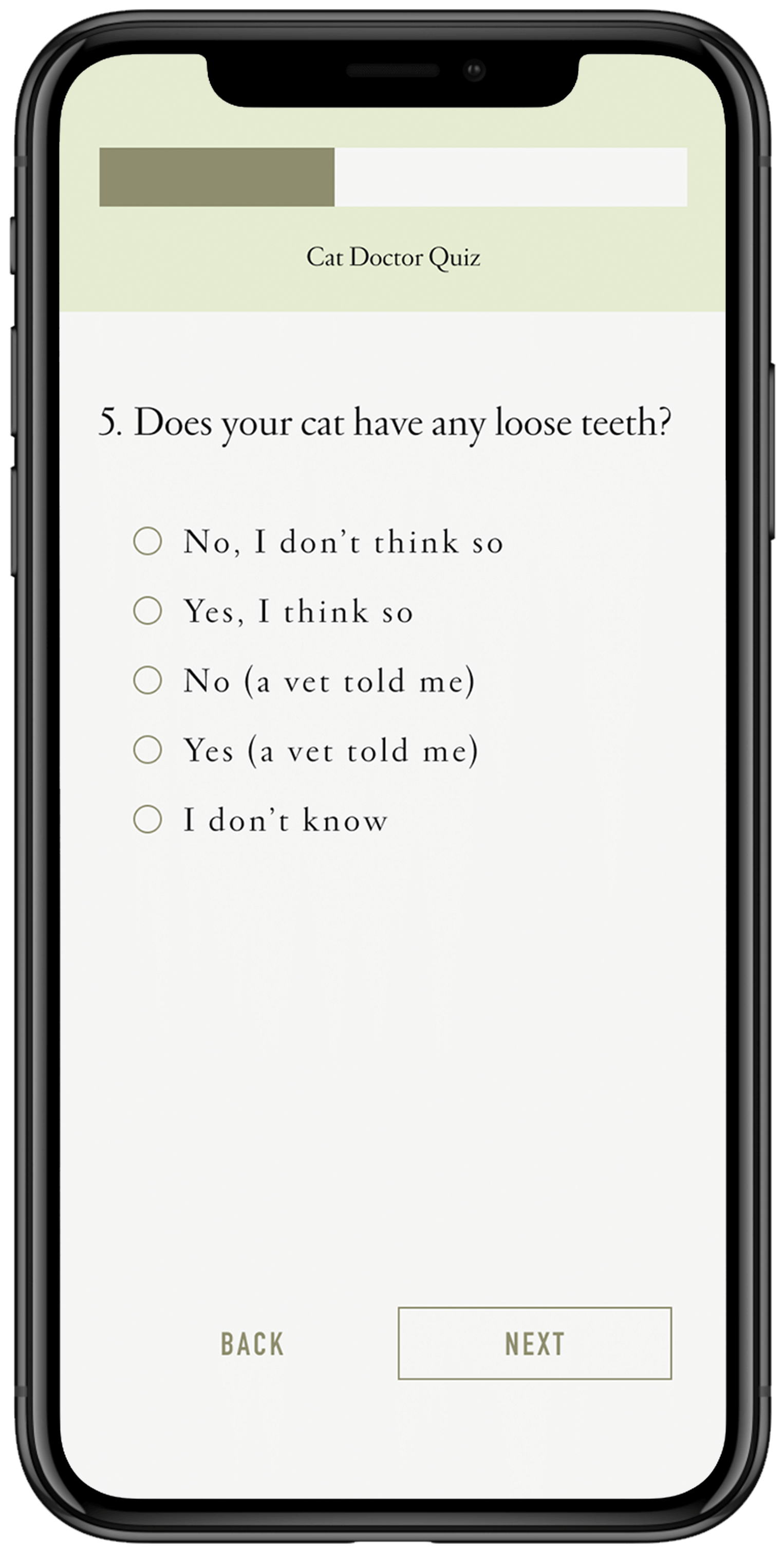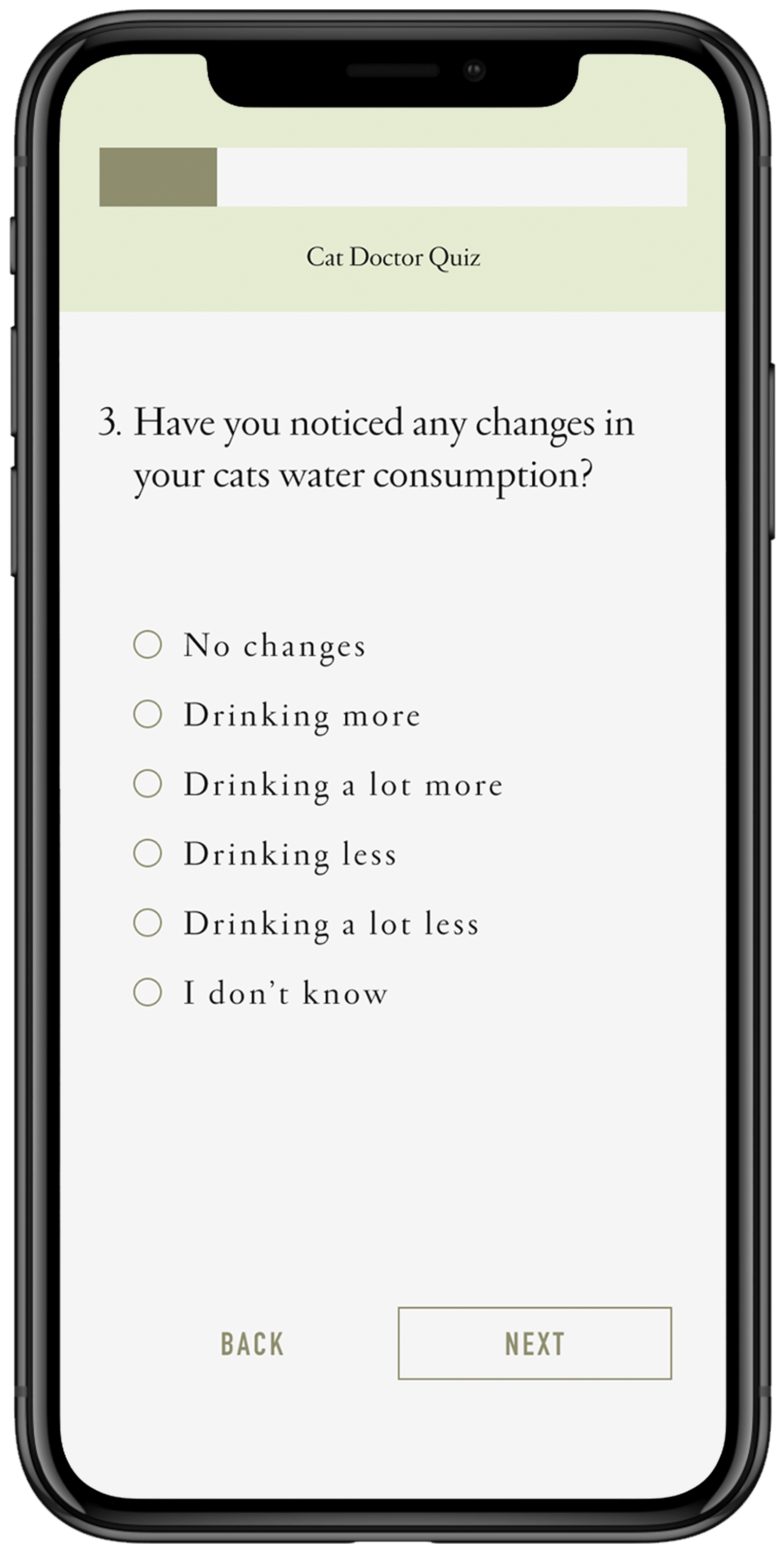 For the next addition to the online learning center, we wanted something engaging and personal that our clients could interact with. What initially started as a quiz quickly grew into a sort of online diagnostic tool. Our hope for this tool is that it will help clients make more informed decisions about their cat's wellbeing.