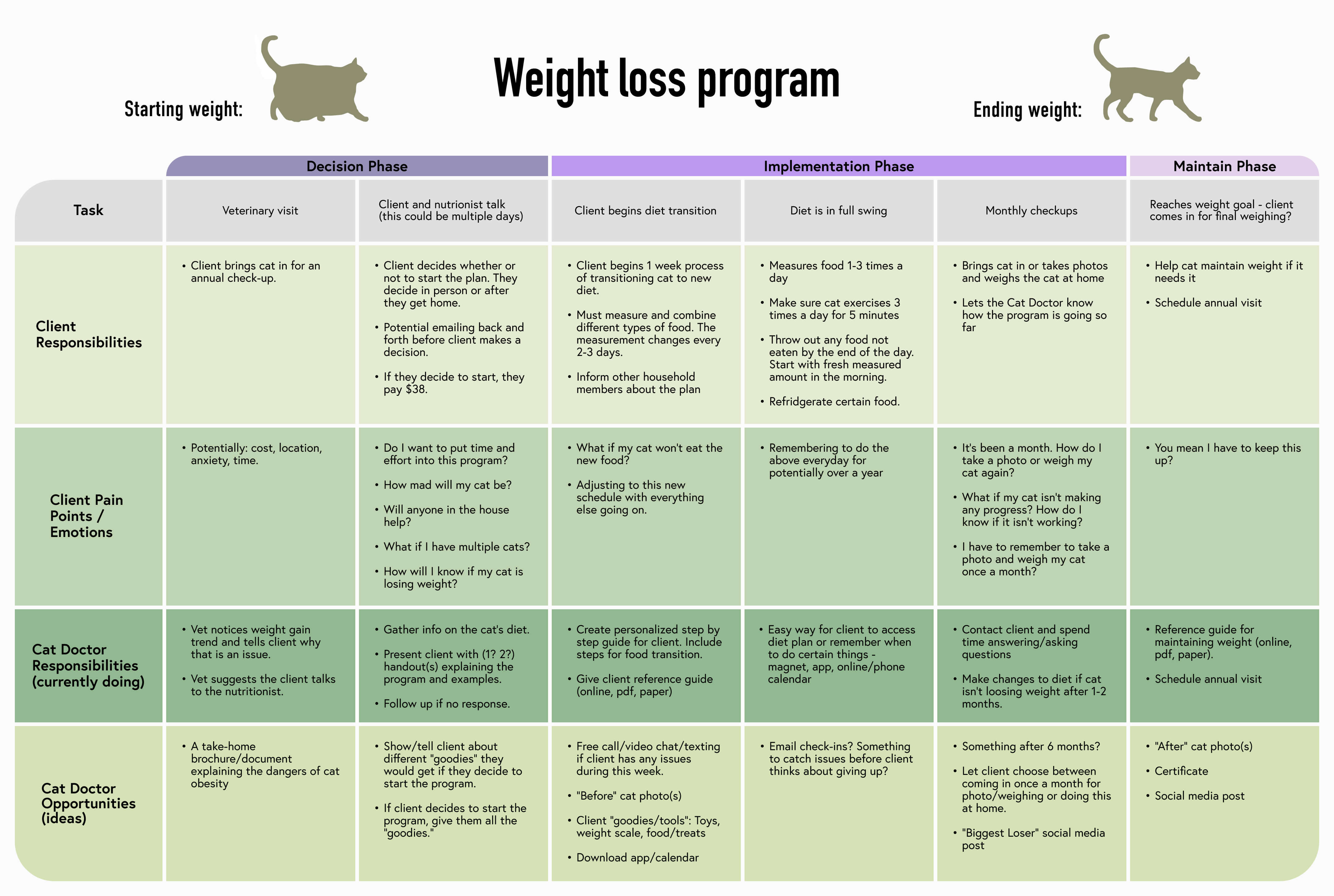 Before COVID-19 hit and while A/B testing our diagnostic tool, we began designing a nutrition program specifically for overweight and obese cats. This program, led by a vet tech at the Cat Doctor who specializes in nutrition, was in the early stages of development and already had a couple clients interested. After we interviewed her and reviewed the current handouts, I created the journey map below. This details current client responsibilities vs Cat Doctor responsibilities and current client pain points vs Cat Doctor opportunities.